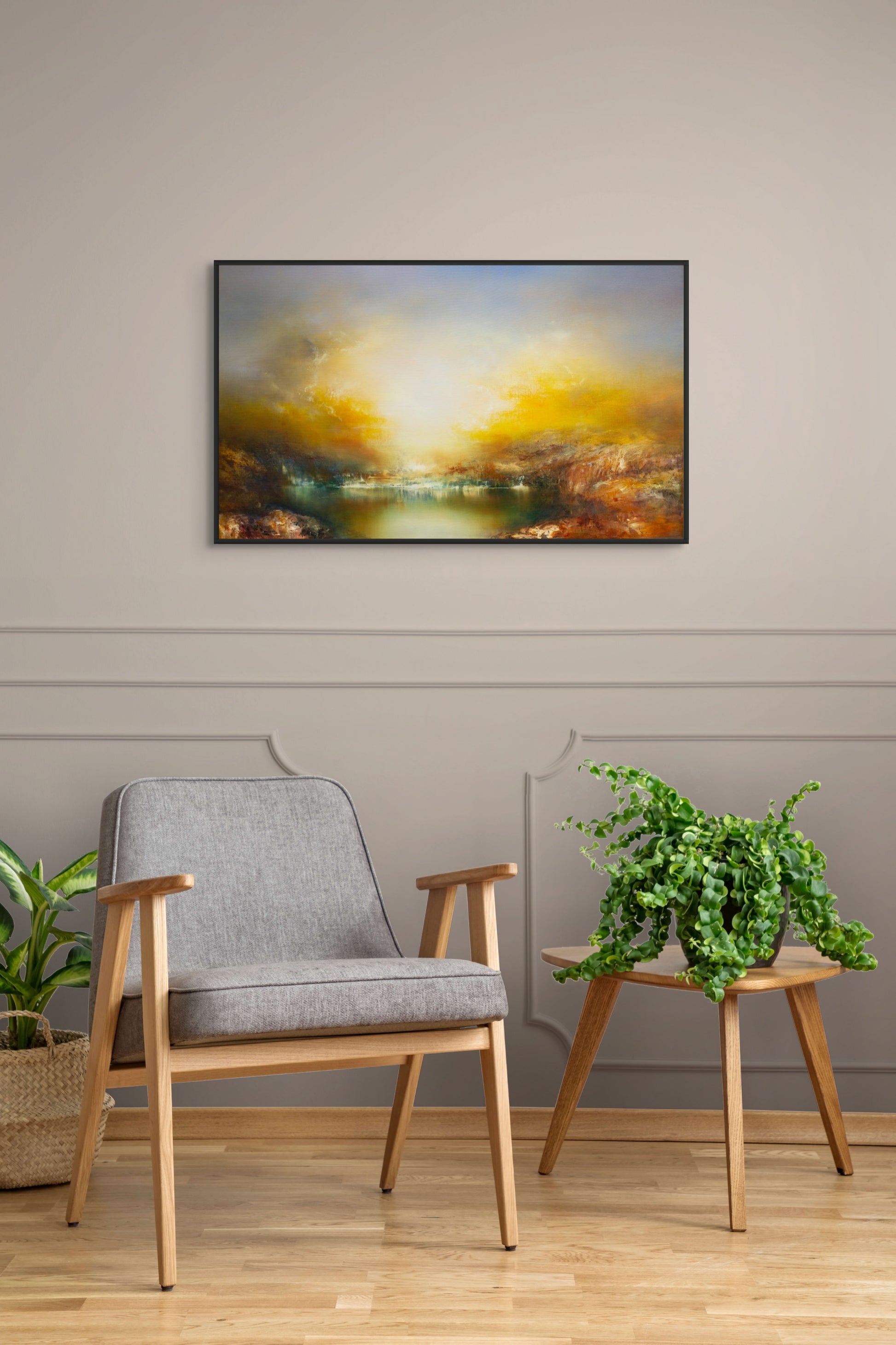 Mostly referencing the semi-abstract landscape paintings by JMW Turner, Ancog builds layers of oil on textured under paintings to achieve the translucent and vibrant colours reminiscent of works of the old maters. However, he illuminate the landscapes with his expert use of tonal values utilising a contemporary palette that brings comforting warmth and elevating luminosity. The compositions are not based on particular place but rather imagined images of tumultuous yet serene vista, allowing us the experience the sublime.