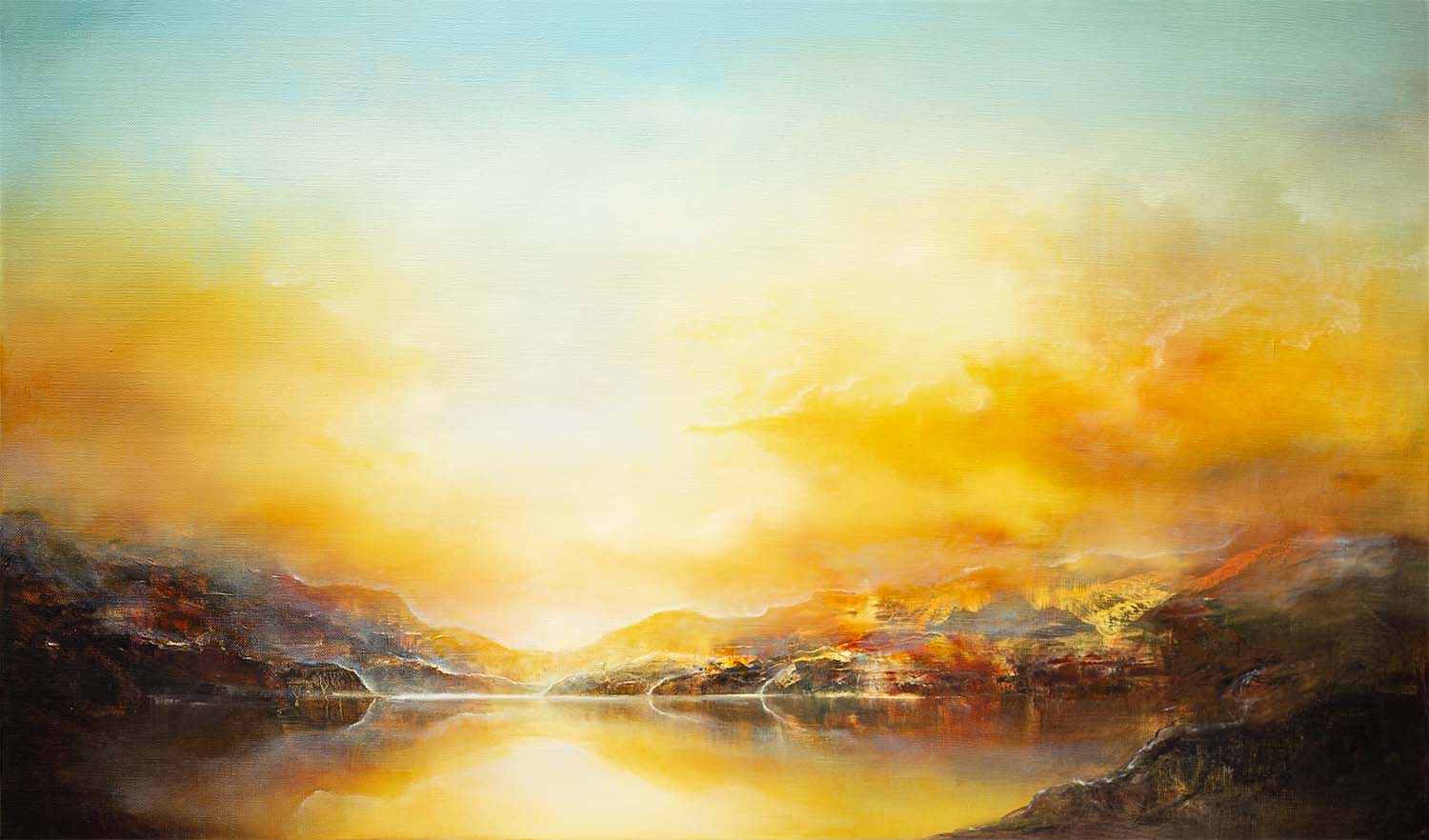 Mostly referencing the semi-abstract landscape paintings by JMW Turner, Ancog builds layers of oil on textured under paintings to achieve the translucent and vibrant colours reminiscent of works of the old maters. However, he illuminate the landscapes with his expert use of tonal values utilising a contemporary palette that brings comforting warmth and elevating luminosity. The compositions are not based on particular place but rather imagined images of tumultuous yet serene vista, allowing us the experience the sublime.
