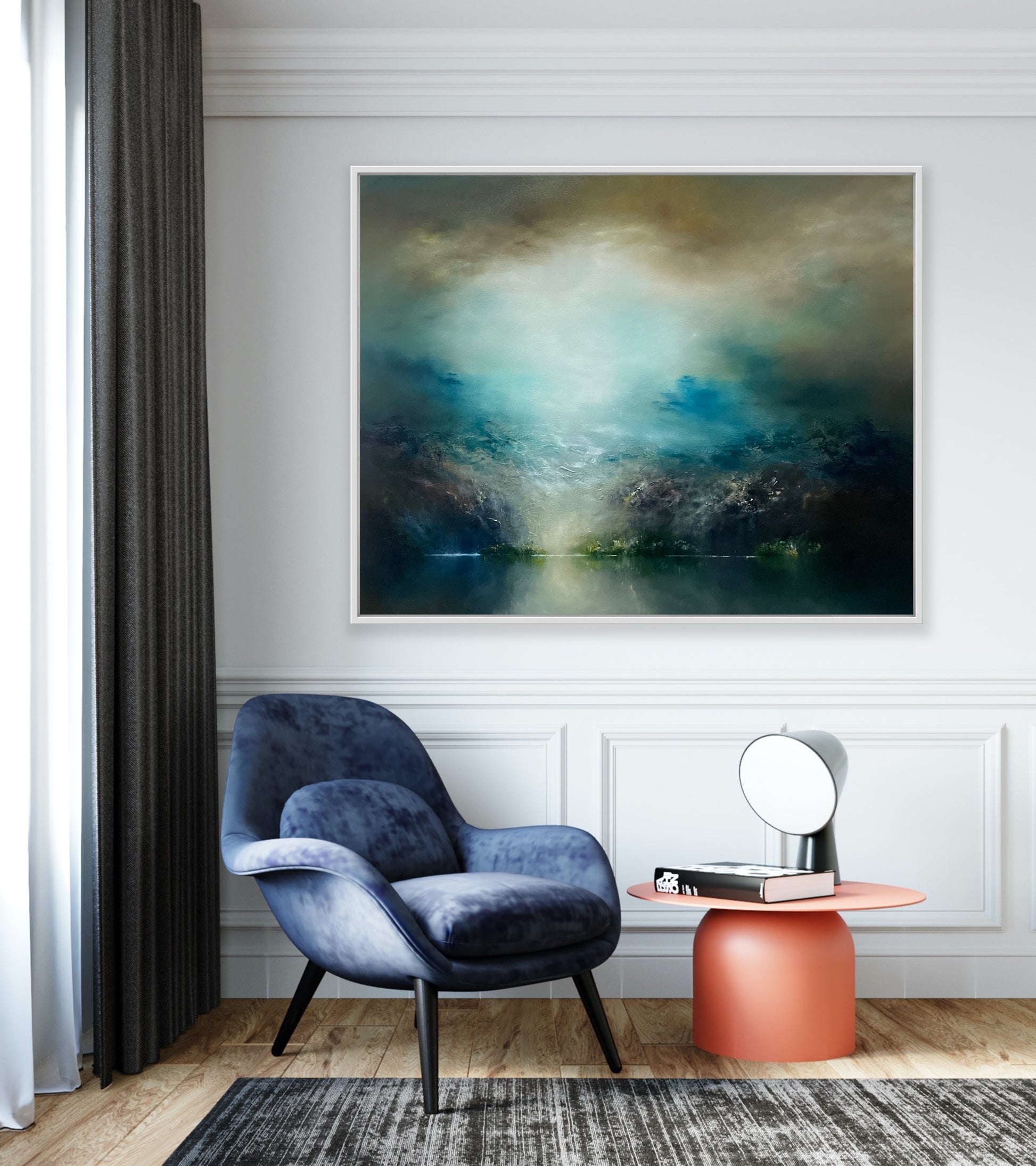 Sacred Realm 30 is part of the new collection exploring emotions through colours and textures. It explores themes of tranquility and serenity in a magical world. These paintings were created with multiple translucent layers of oil paints and comes in a white float frame.