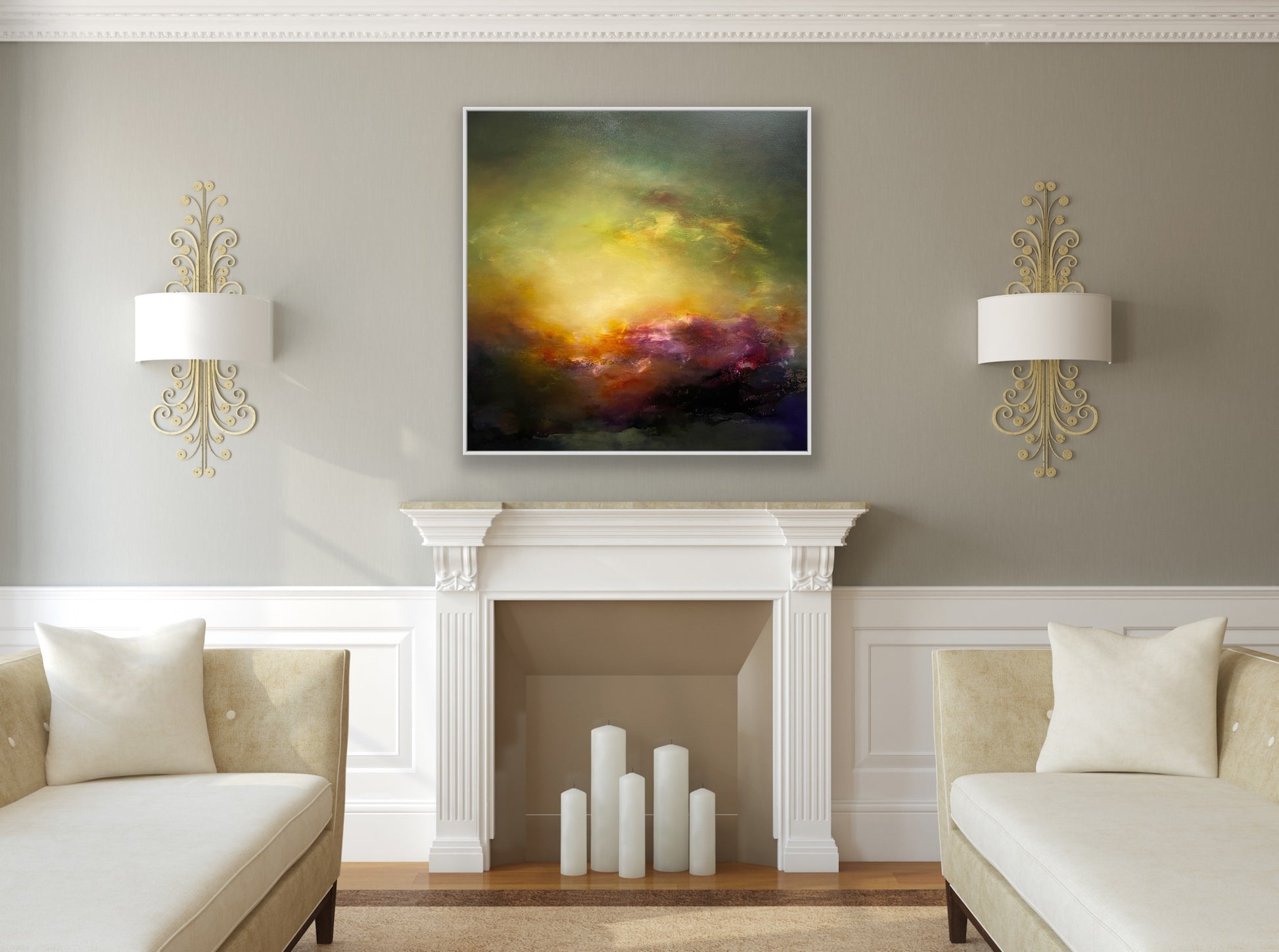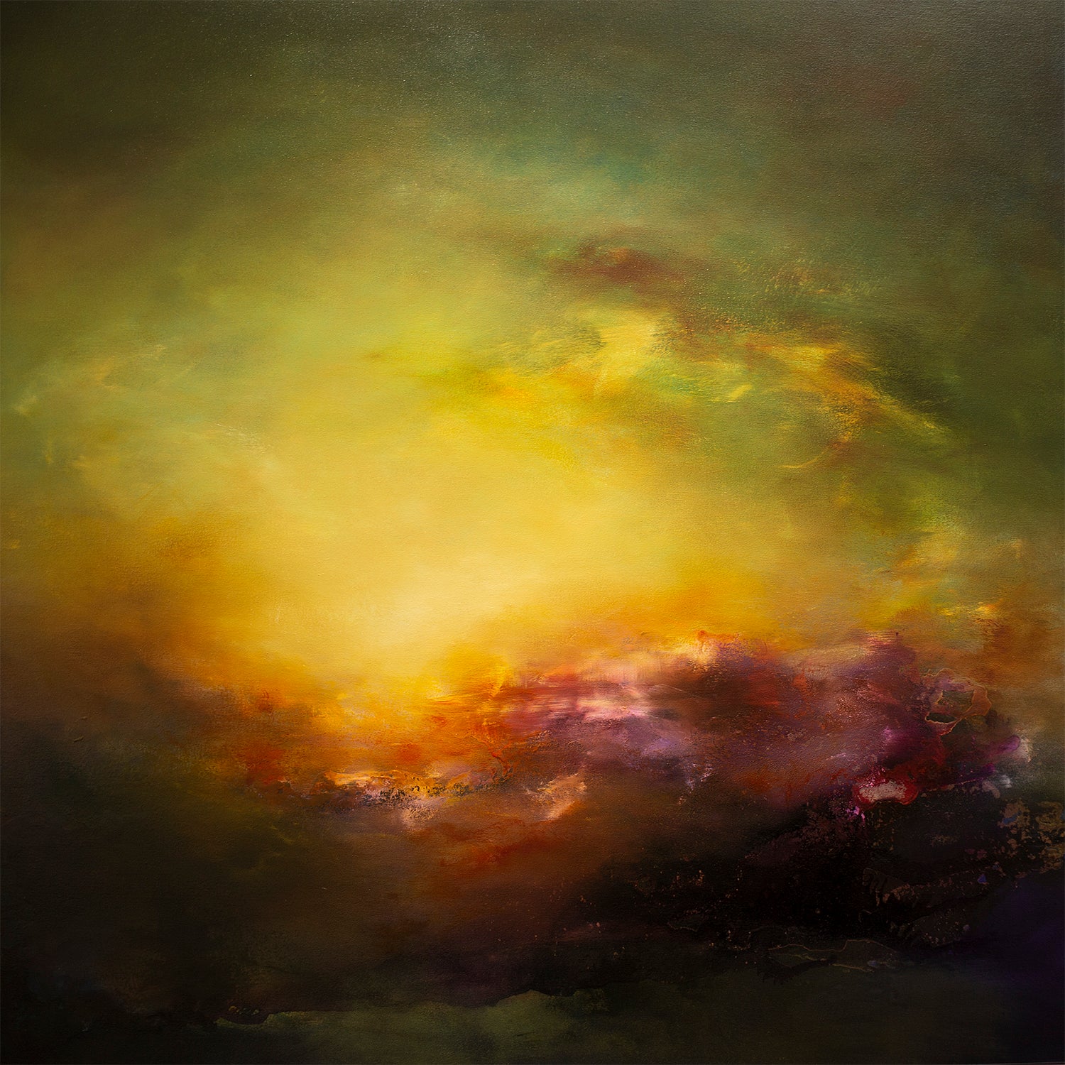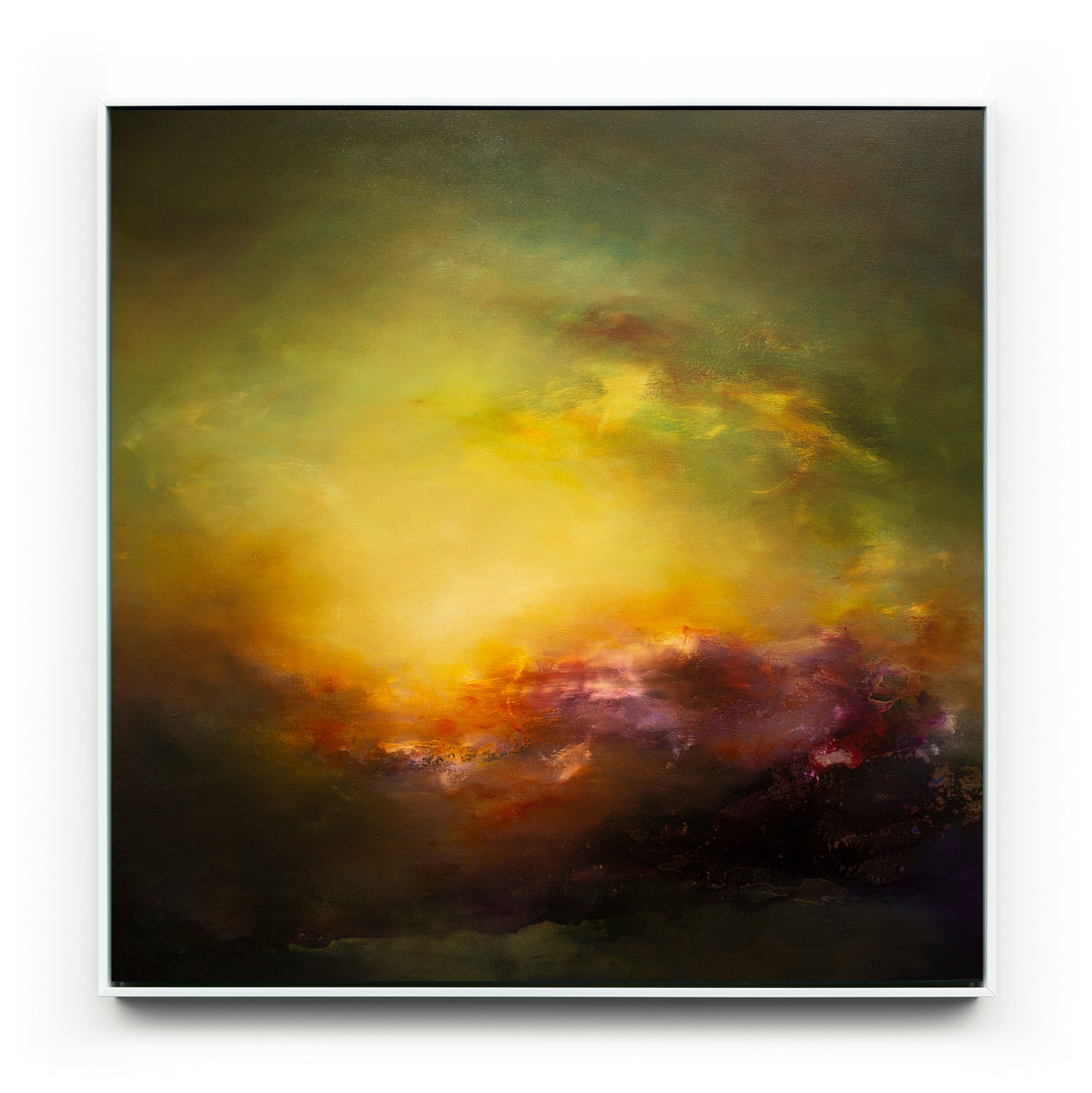 Sacred Realm 32 is part of the new collection exploring emotions through colours and textures. It explores themes of tranquility and serenity in a magical world. These paintings were created with multiple translucent layers of oil paints and comes in a white float frame.