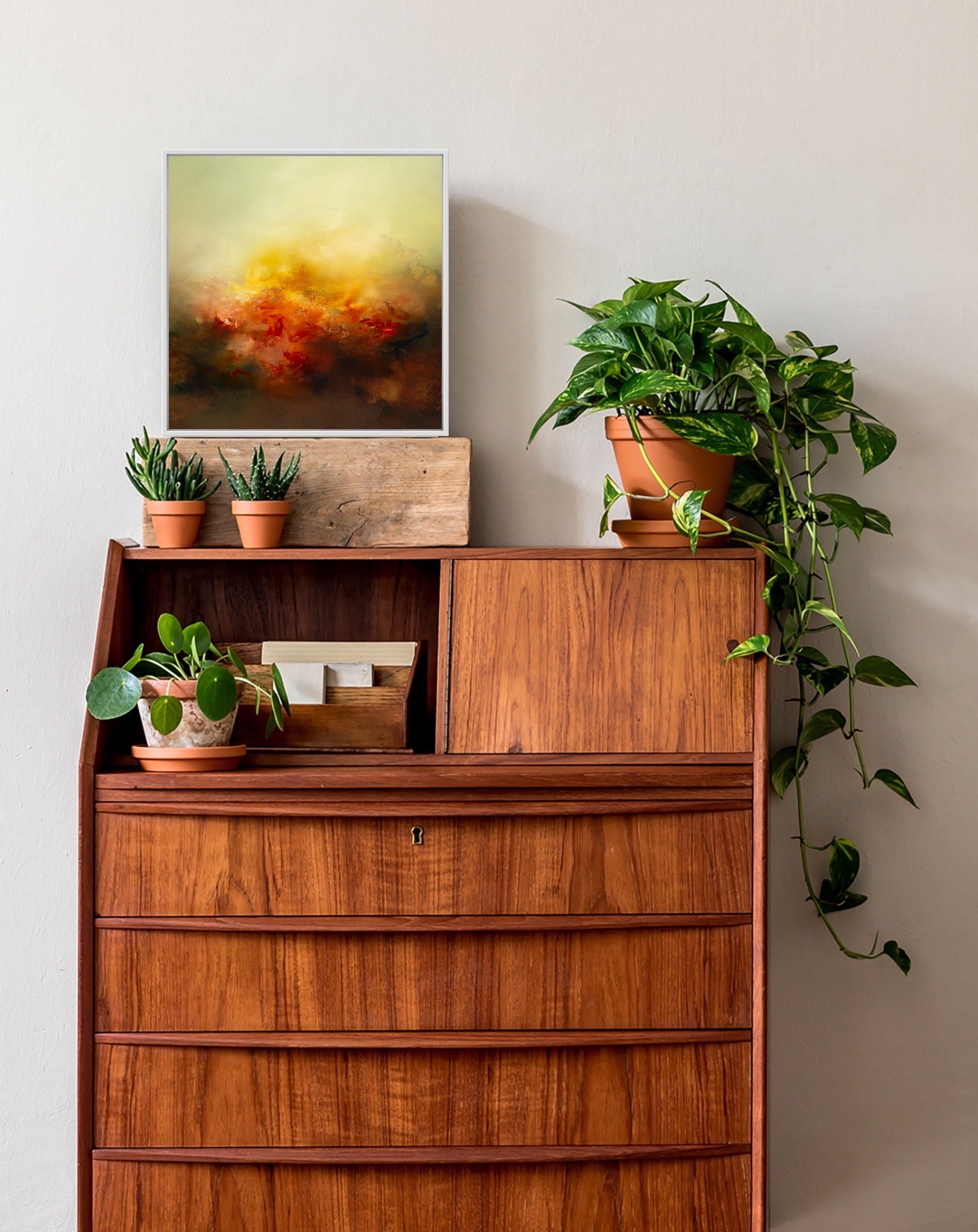 Sacred Realm is a series exploring emotions through colours and textures. It delves into themes of tranquility and serenity in the midst of chaos. These mixed media paintings were created with inks and multiple translucent layers of oil paints and comes in a white float frame.