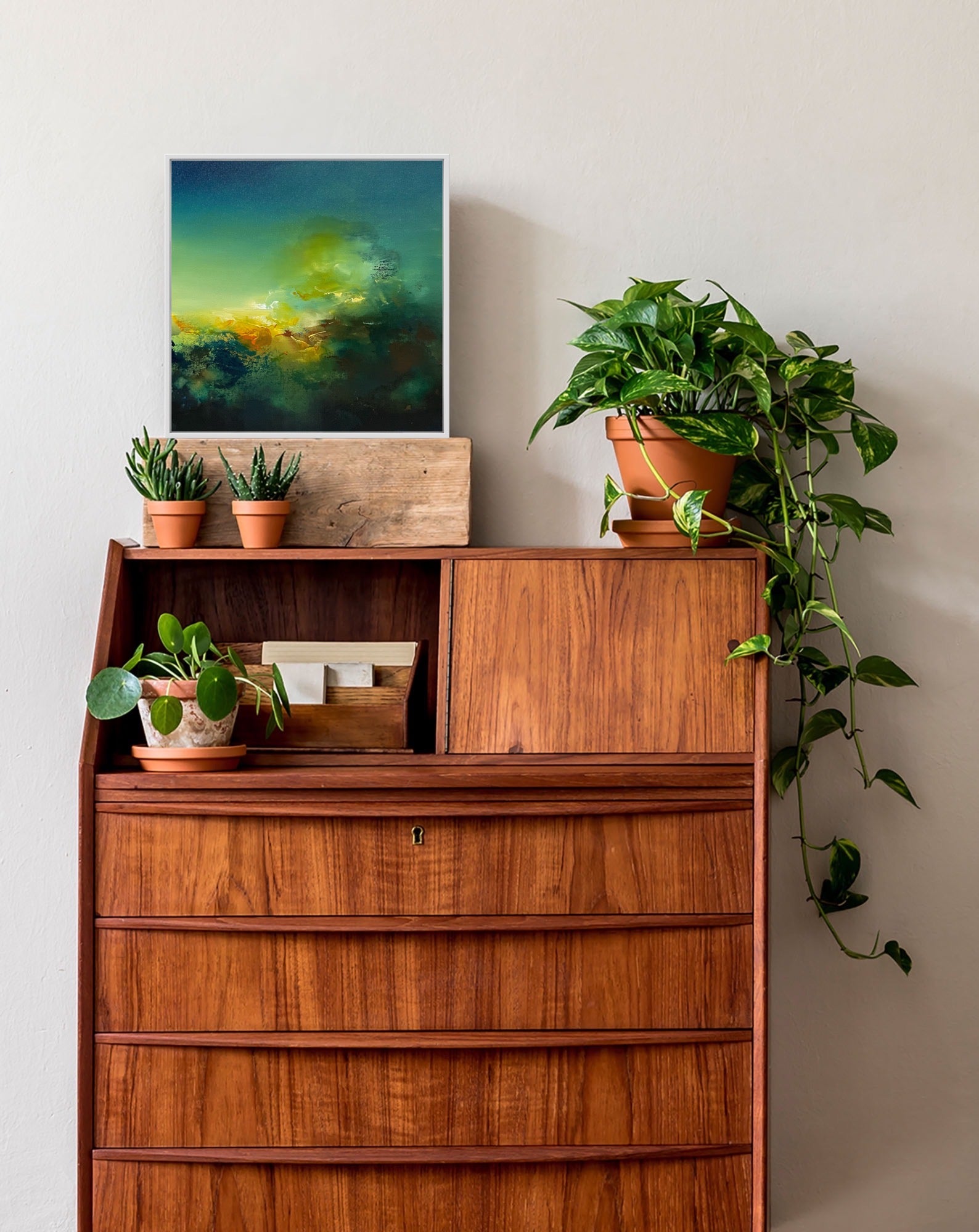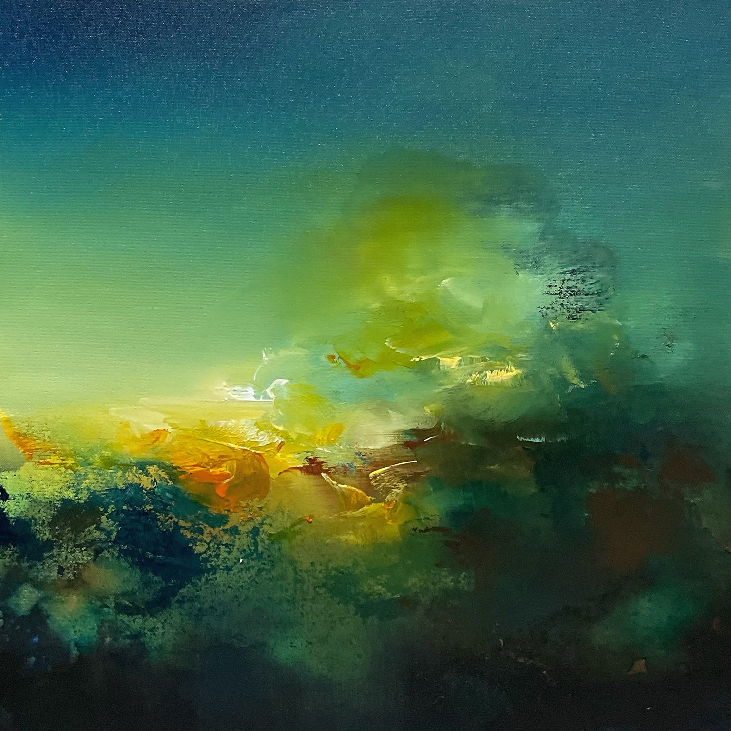 Sacred Realm is a series exploring emotions through colours and textures. It delves into themes of tranquility and serenity in the midst of chaos. These mixed media paintings were created with inks and multiple translucent layers of oil paints and comes in a white float frame.