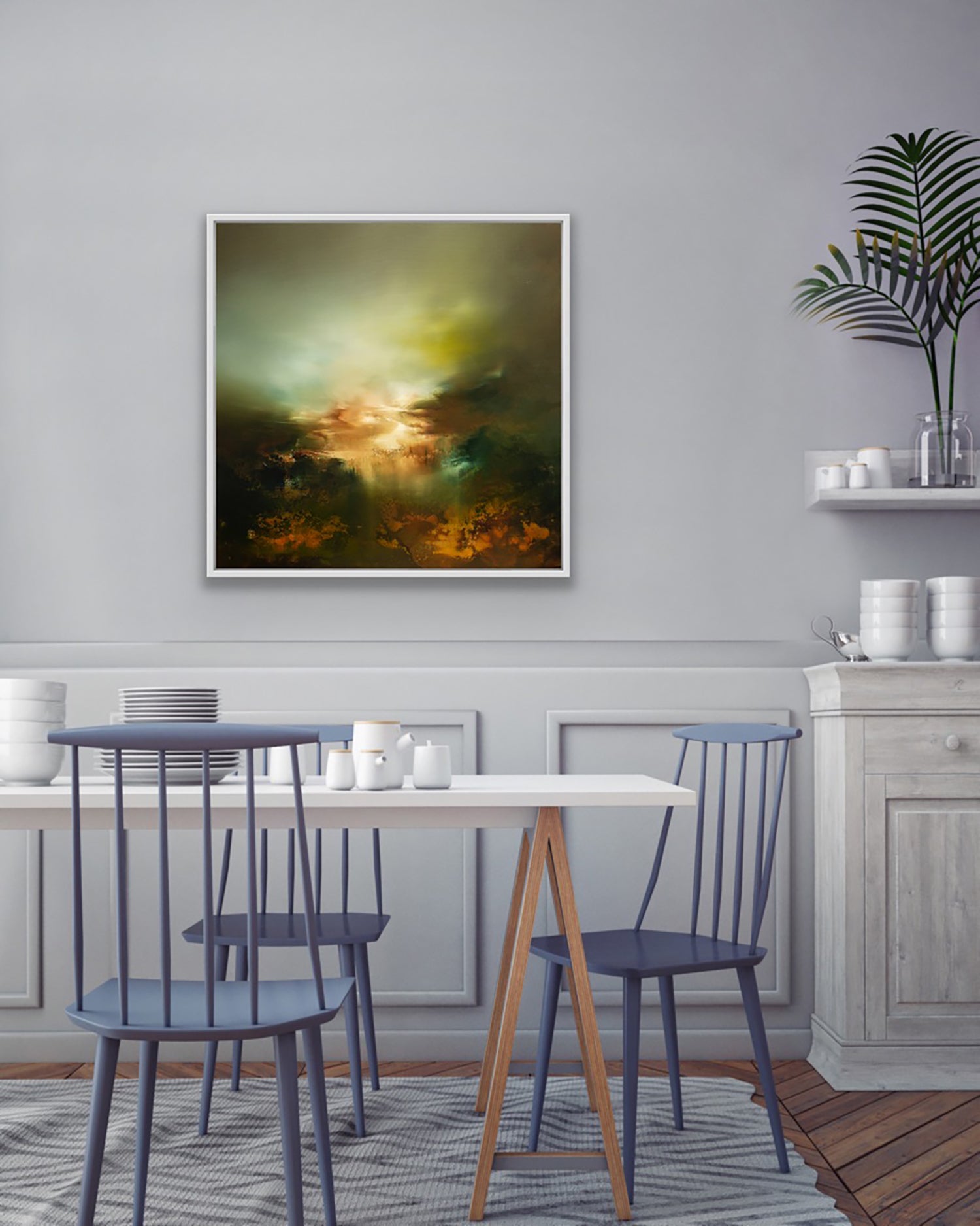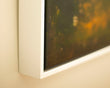 Sacred Realm is a series exploring emotions through colours and textures. It delves into themes of tranquility and serenity in the midst of chaos. These mixed media paintings were created with inks and multiple translucent layers of oil paints and comes in a white float frame.