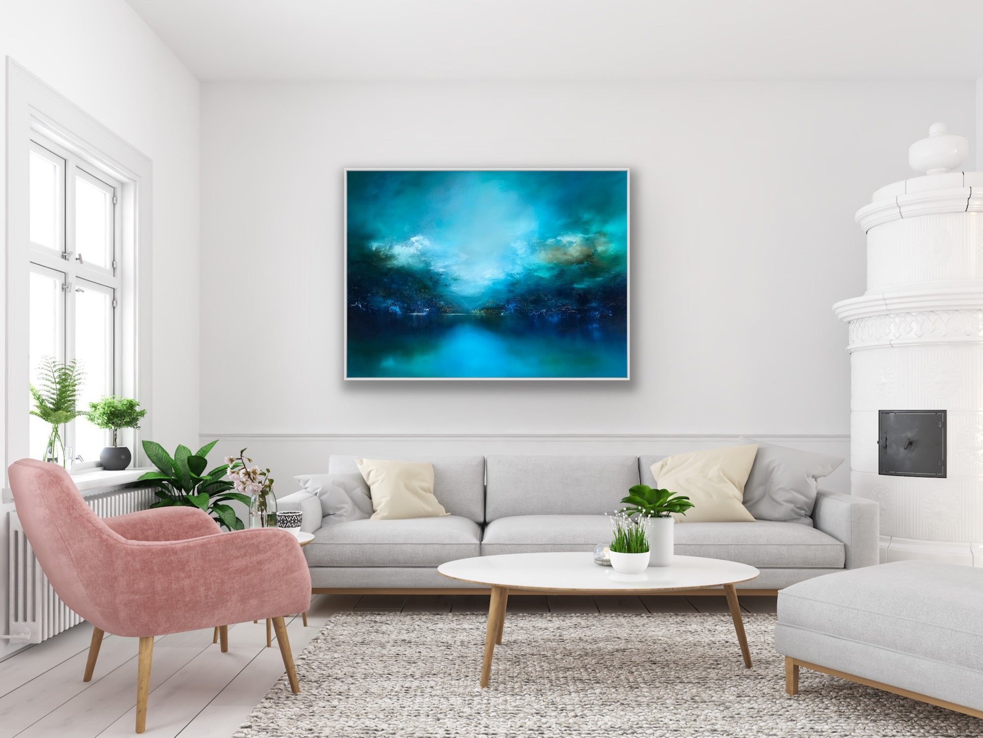 Sacred Land III is part of the semi-abstract landscape collection exploring emotions through colours and forms seen in nature. It delves into themes of tranquility and serenity in a magical world. These paintings were created with multiple translucent layers of oil paints and comes in a white float frame.