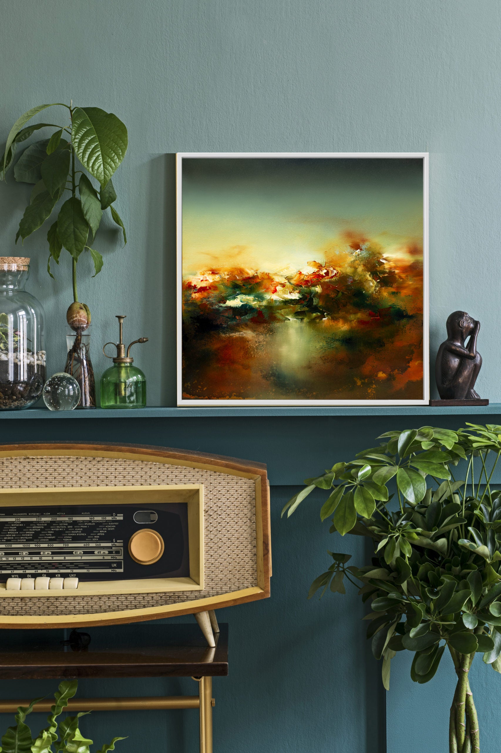 Sacred Realm is a series exploring emotions through colours and textures. It delves into themes of tranquility and serenity in the midst of chaos. These mixed media paintings were created with inks and multiple translucent layers of oil paints and comes in a white float frame.